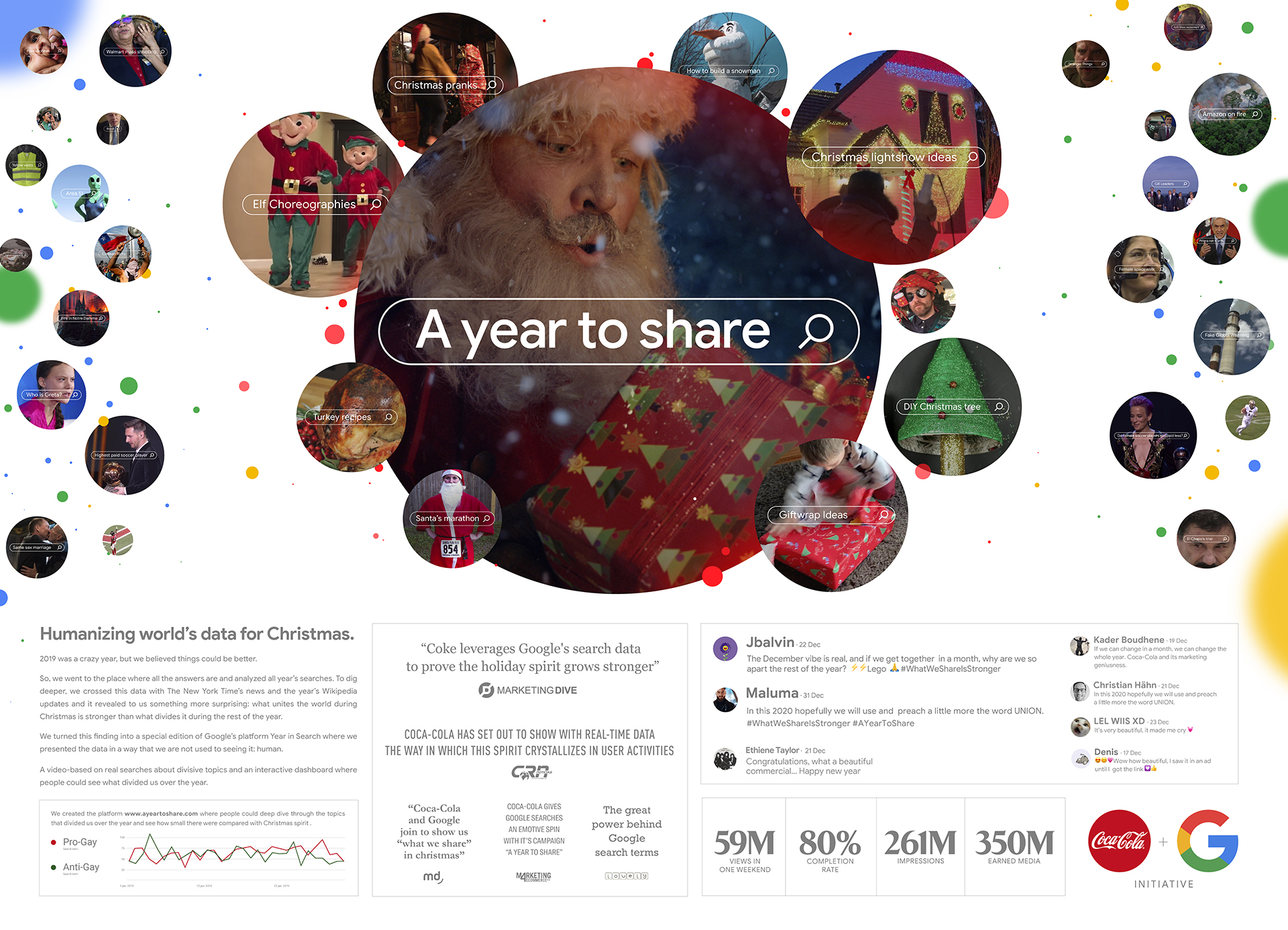 2019 was the most polarized year of the decade. We turned this finding into a special edition of Google’s platform Year in Search, a video-based on real searches about divisive topics and an interactive Dashboard where people could see what divided us over the year. A Year To Share became one of the most shareable actions of 2019’s Christmas, reaching a record of views in a single weekend and proving to the world that there’s still hope. This video is the 3rd most watched video in the history of Coca-Cola.