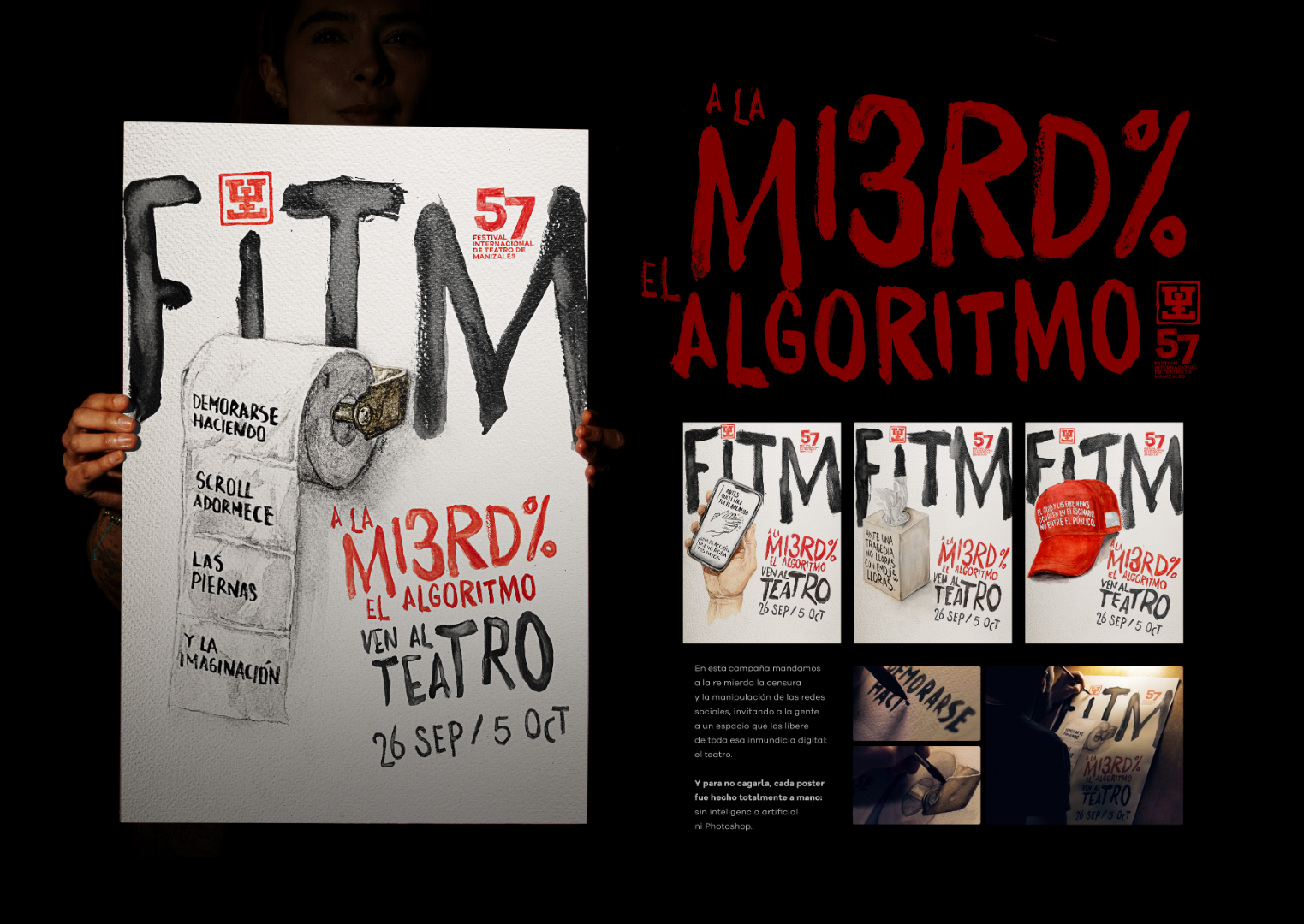 In this campaign, we say fuck you to censorship and manipulation on social media, inviting peopleto a space that frees them from all that filth: the theater. And to make sure we didn’t screw it up, each poster was made entirely by hand: no Photoshop, and each radio reference featured real actors, despite the availability of artificial intelligence voices.